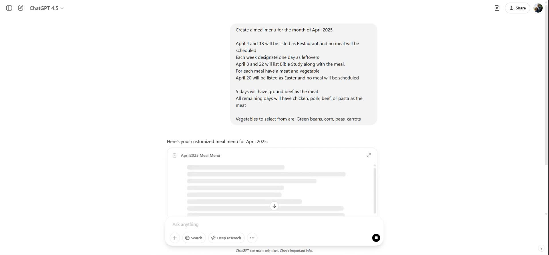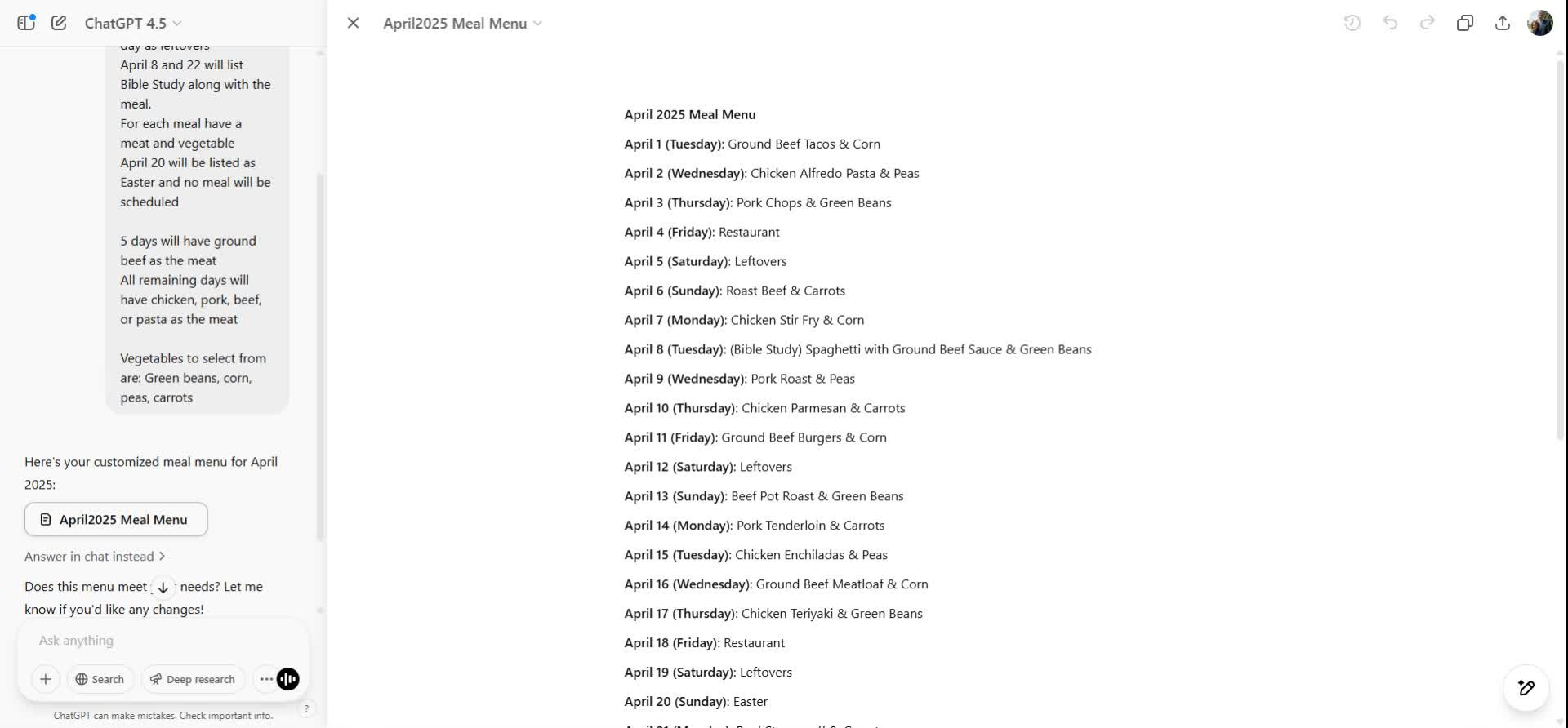 Use the prompt: "Create a meal menu for the month of April 2025".